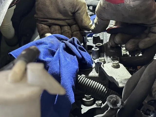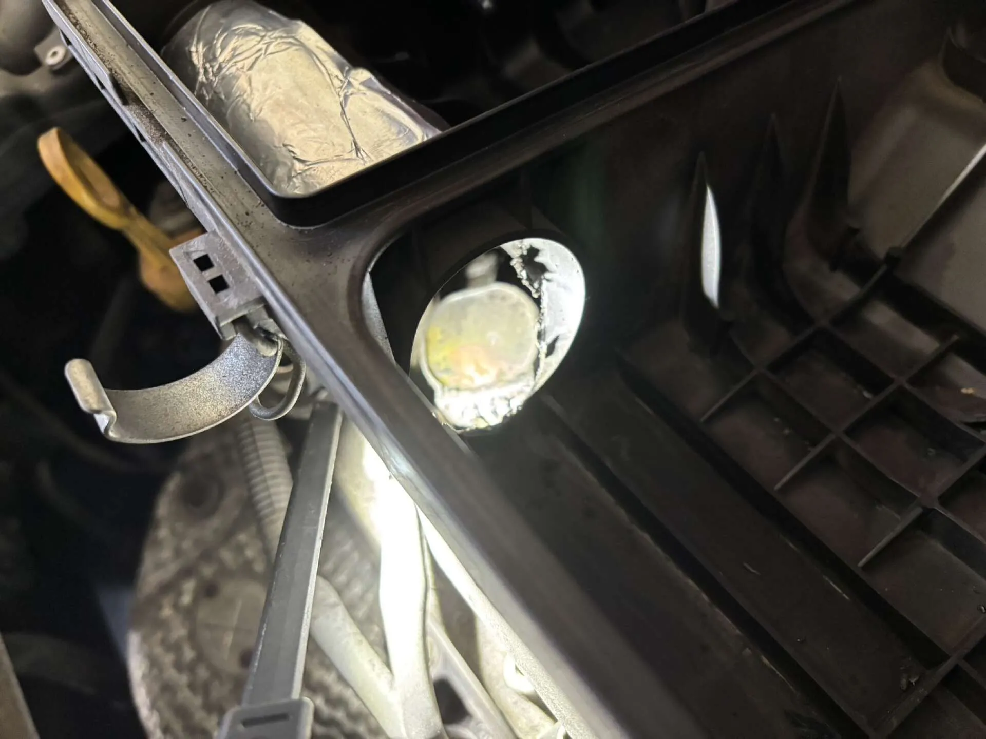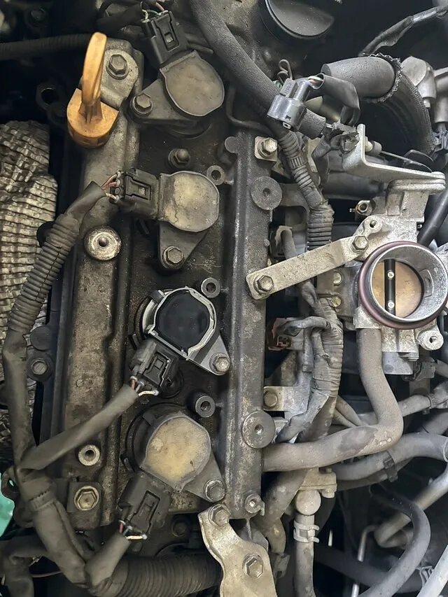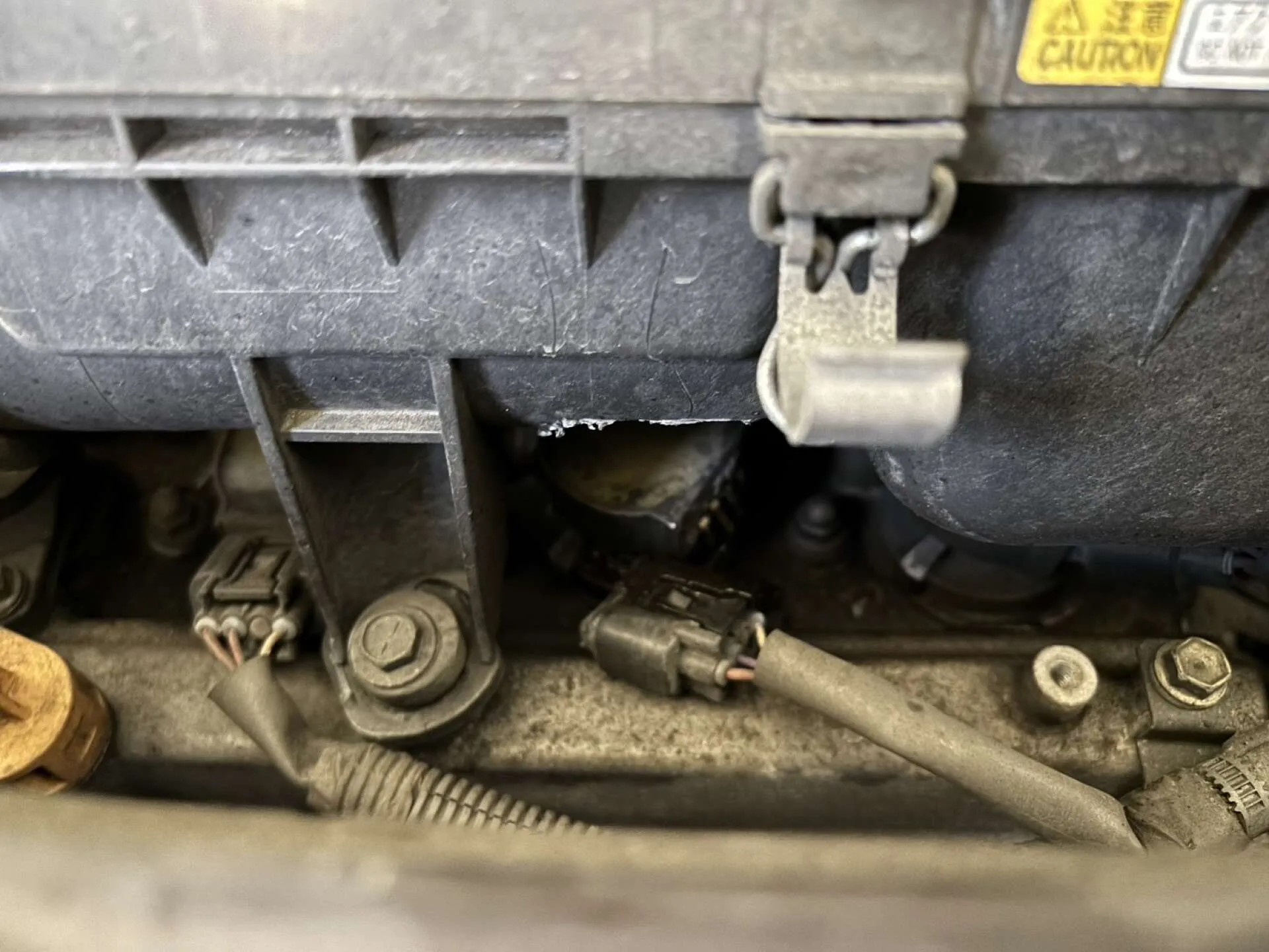 ボンネットを開けて調べるとエアクリーナのケース下の隙間からイグニッションコイルに繋がっているコネクターが破損しているのが見えました。