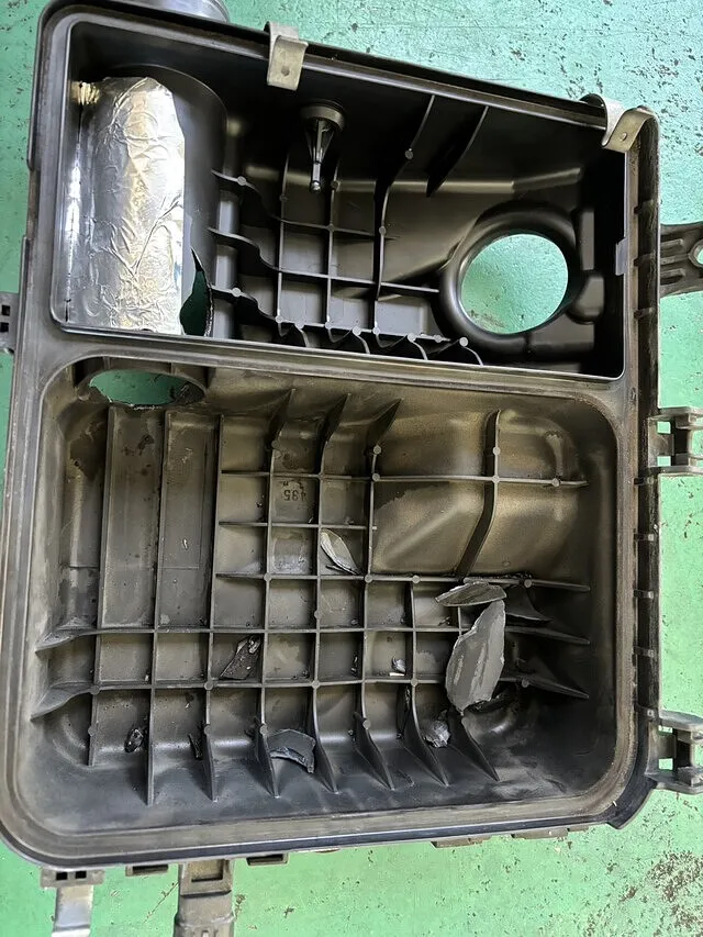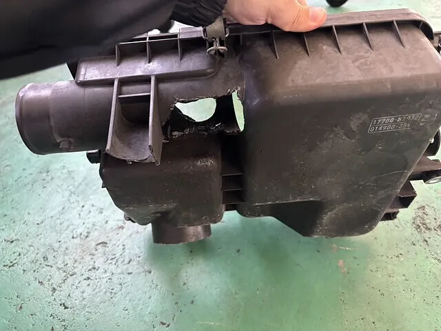 ケースを開けてエアエレメントを外してみると、ケースにも穴が開いていました。